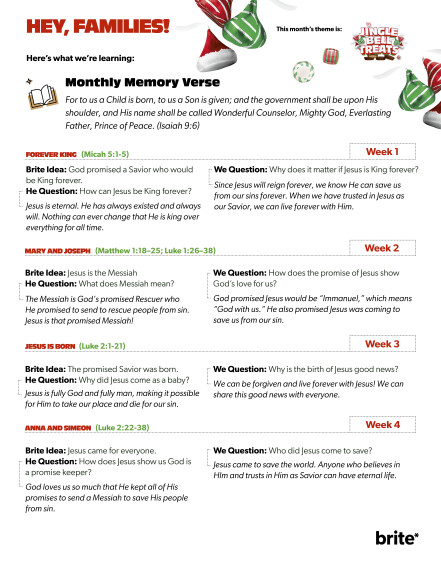 Christmastime holds promises—joy, lights and even sweet treats. Kids will learn about the sweet promises God kept at Christmas. As someone may have anticipation for a recipe to finish baking many had great anticipation as they waited for the promised Messiah. This month reveals how God’s promises are always sweet!